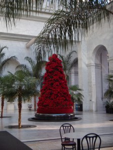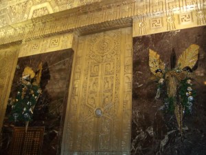 The interior is like stepping into a temple of the Maya, with its stepped ceiling in the shape of a ziggurat. The gold and green holiday decorations contrast with the dark Levanto marble and echo the gold, bronze and silver tones of the extensive metal work, which evoke Mayan figures, in the stunning lobby.
