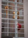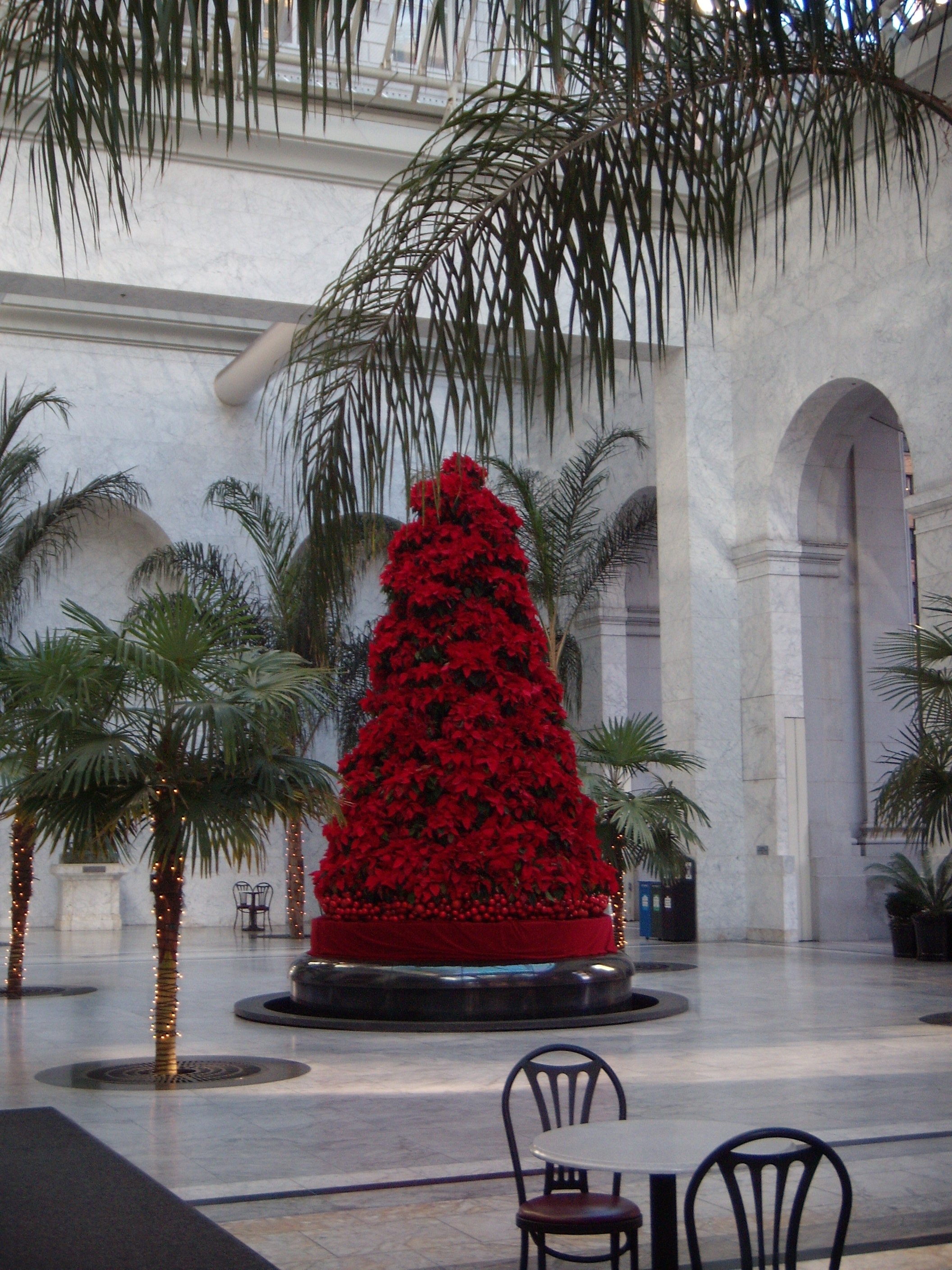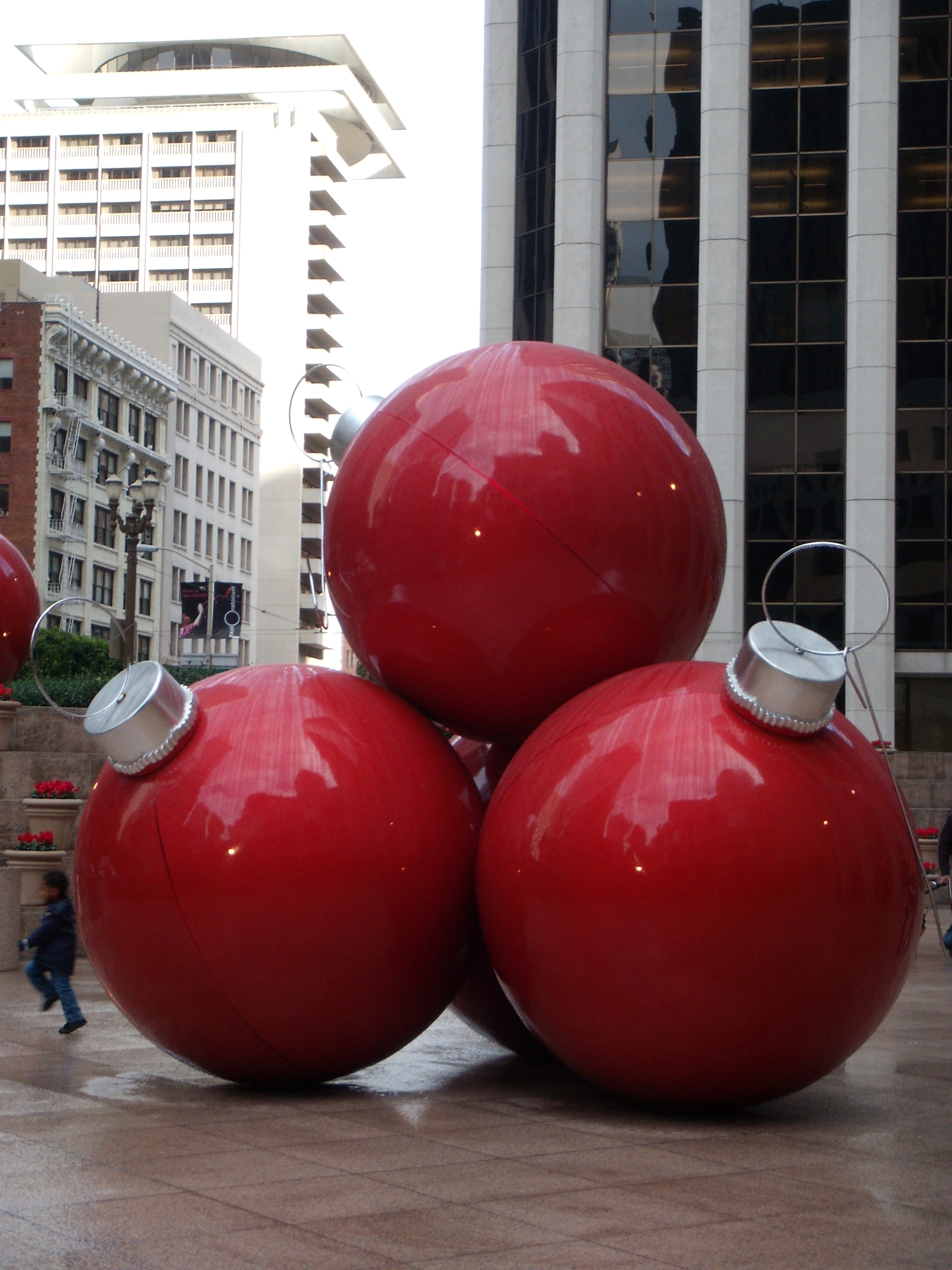 The plaza is currently dominated by giant red steel Christmas tree ornaments. You will feel like a Lilliputian next to these giants, which are nicely accented by an array of potted red Cyclamen. There are two big block of concrete steps in the plaza (like a ziggurat!) to relax or watch seagulls bathe in the nearby fountain.