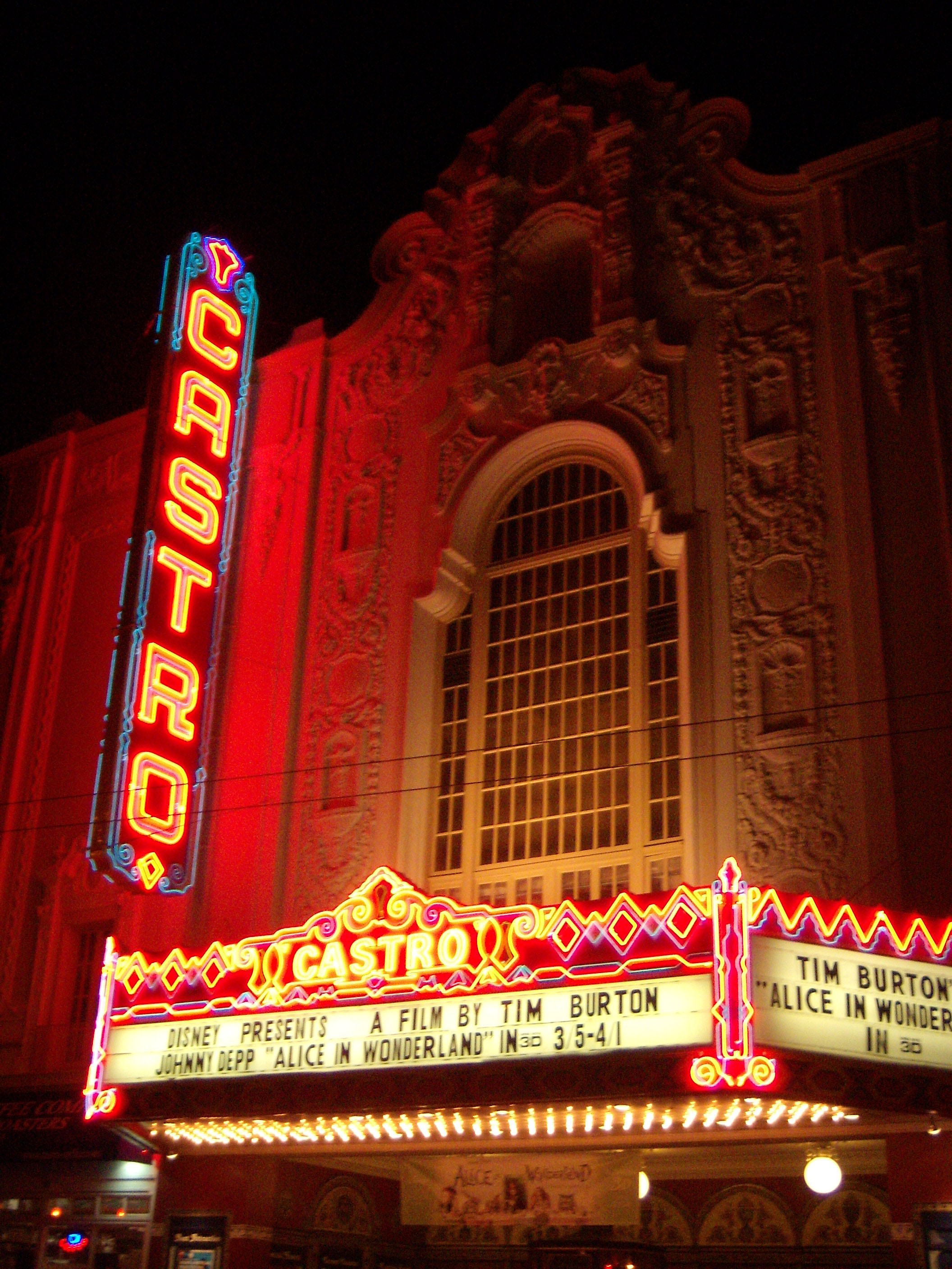 Combined with the repairs in the late autumn of 2007 of the signature neon vertical, which was architect A.A. Cantin’s 1930s contribution, the theatre is looking quite de-lovely. The vertical sign and the marquee were repaired and painted for Gus Van Sant’s Academy Award winning movie, “Milk,” in which Sean Penn won the Oscar for best actor his portrayal of one of America’s first openly gay politicians, Harvey Milk. Many scenes were filmed in the neighborhood. During the filming, there was a security guard stationed at night outside Milk’s former camera store, Castro Camera at 575 Castro, which was restored to 1970s retro perfection for the movie. You can read more about the filming in early 2008 here in the San Francisco Chronicle.