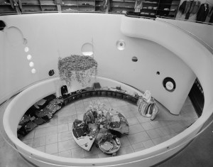 Wright was a bit obsessed with the spiral, according to Brendan Gill, in his amazing biography, Many Masks, A Life of Frank Lloyd Wright. The spiral appeared in many unrealized projects, as well as in the Hoffman Jaguar salesroom in New York. It is of course best known in the Guggenheim on Fifth Avenue in Manhattan.