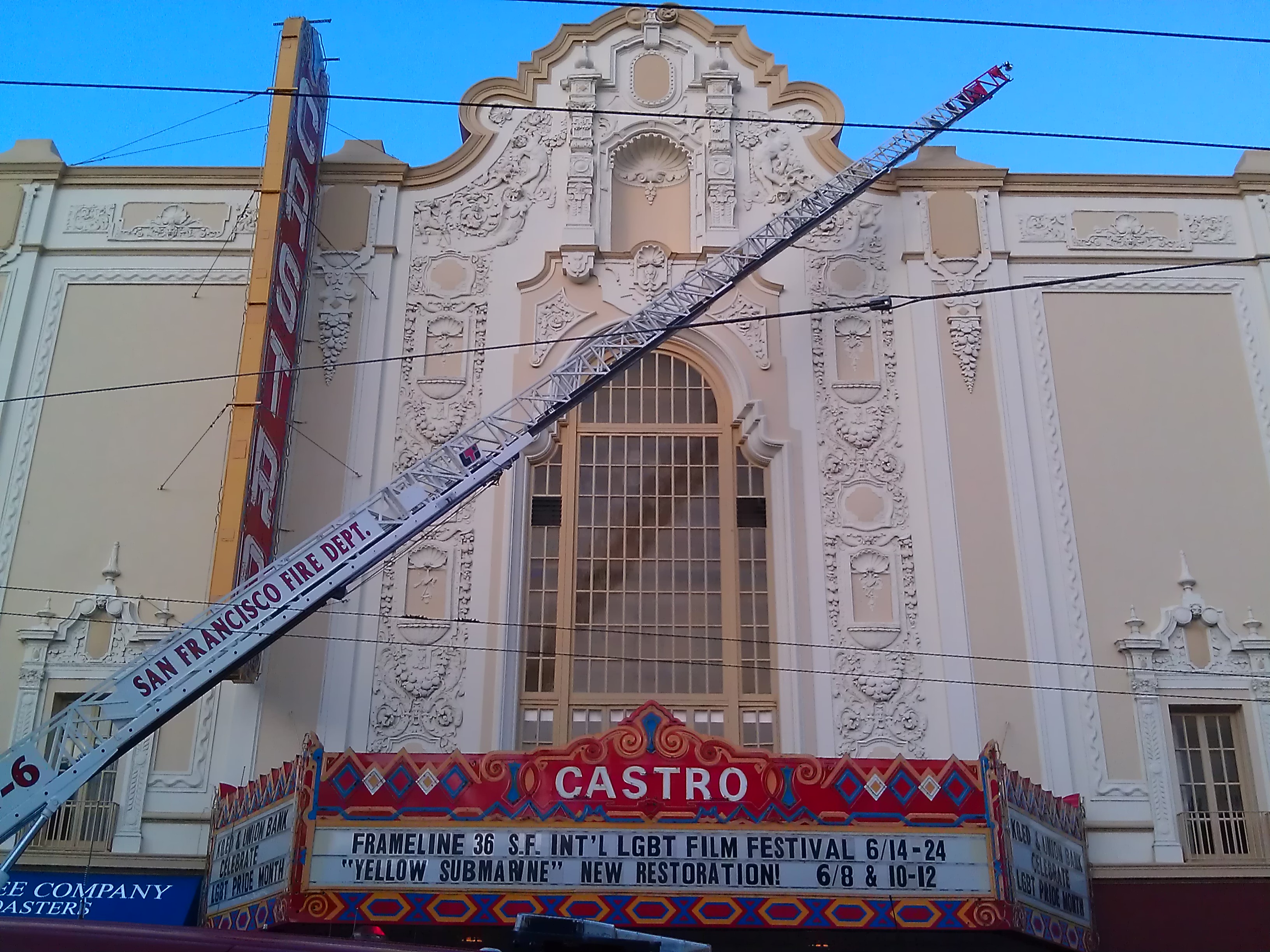 It’s not a sight you want to see. As I came out of the Muni underground at Castro Street earlier this week, police cars were blocking traffic at the corner of Market and Castro, and three fire trucks and their crews were busy in front of Timothy Pflueger’s famous Castro Theatre. Two long ladders were stretched all the way up to the roof of the 1922 building.