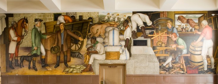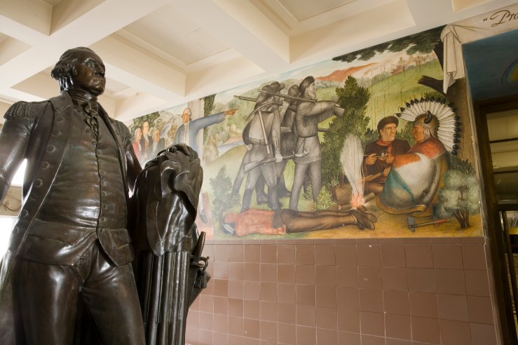 Arnautoff’s murals tell the story of the life of George Washington, the first president of the U.S. But Arnautoff, an émigré from Russia and a student and friend of Rivera, painted an unflinching view of Washington, especially for the 1930s. There are no story-book tales and Arnautoff’s view of America as a leftist and Communist, was radical in its time.